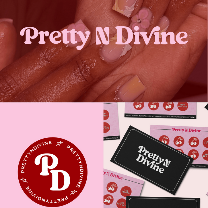 PrettyNDivine is a growing brand created by a nail artist who’s now stepping into her role as a mentor and educator. After years of doing nails and building a strong online presence, she wanted a brand that reflected where she’s headed, not just doing nails, but teaching others how to build their own successful businesses. This project was all about giving her a new look and website that feels more like her now: bold, confident, and built for bigger goals.
